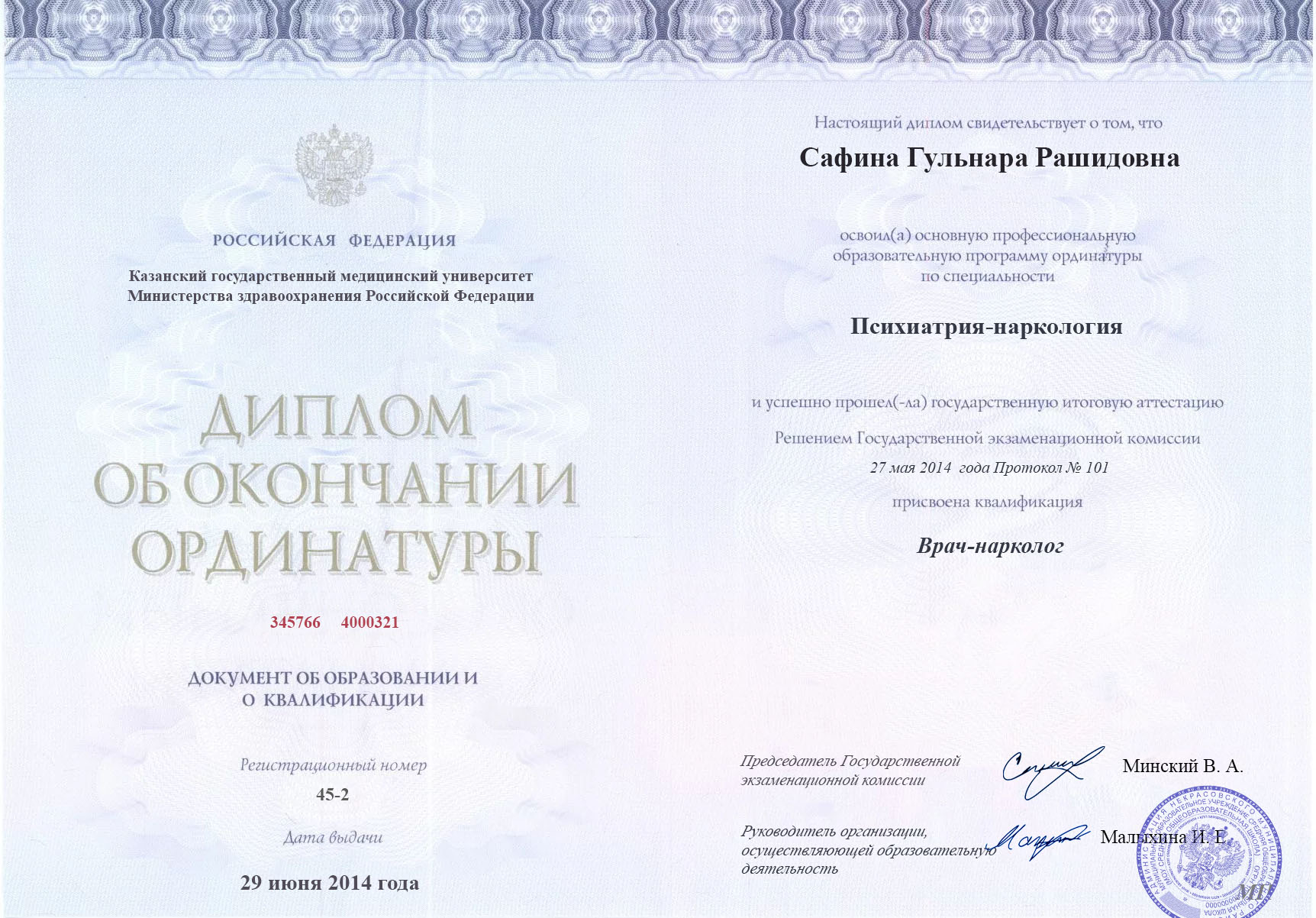 Диплом об окончании ординатуры Сафиной Гульнары Рашидовны